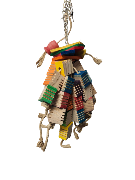The Feathered Friends Just for Fun Crazy Blocks is a vibrant jumble of colourful wooden blocks, perfect for chewing! Featuring multiple layers of blocks, all securely attached to a sturdy chain for easy hanging, this toy is a great addition to your bird's toy rotation, keeping them engaged and entertained.