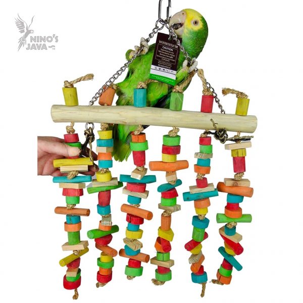 Now with chain on the verticals and a hanger for easy placement. Check out the tough, colourful Java wood—coloured with food-grade dyes, it's all-natural and safe for your bird.